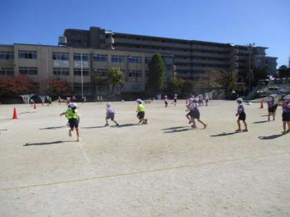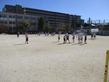 体育の時間は,運動場でパスゲームをしています。