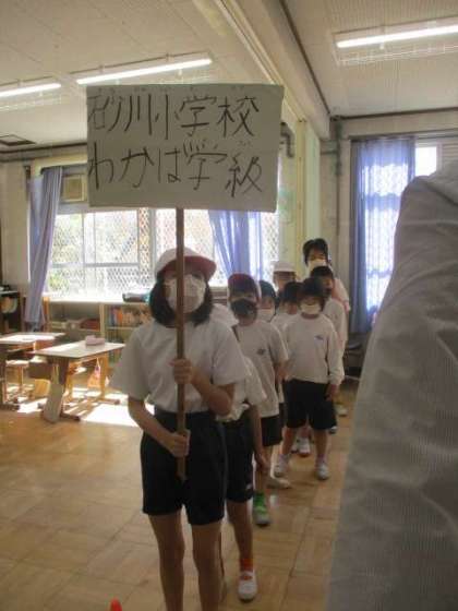 「砂川小学校」と書かれた子どもたち手作りの看板をもって入場をする練習をしました。