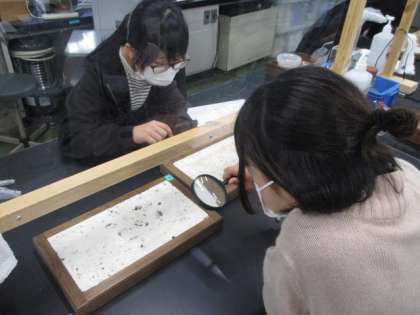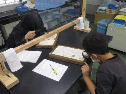 石灰岩が何でできているかを知るために、虫眼鏡を使って観察しました。