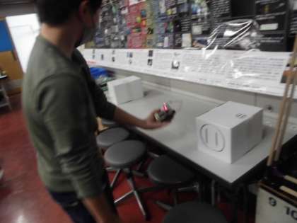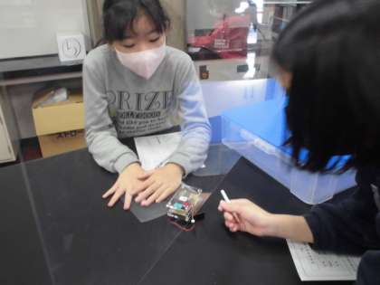 センサーの使い方を知り、宝物がどこにあるか探しています。協力し合いながら実験を進めていました。