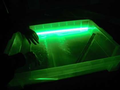 振動がどのように伝わるのか水の波を観察しました。記録もしっかりとっています。暗い教室でライトを当てると波の様子がよく分かりました。