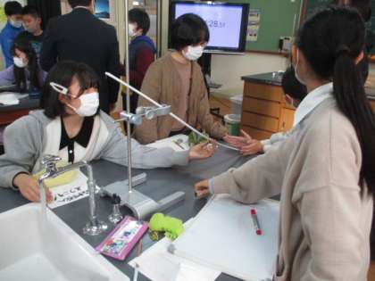 こちらの教室では理科の学習で、ビー玉を遠くに飛ばす方法をみんなで調べました。