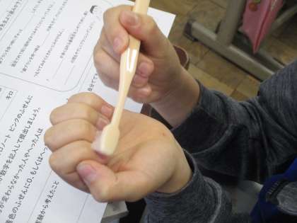 歯ブラシをい使って、自分の爪の付け根を磨き、歯磨きをするときの強さを確かめました。