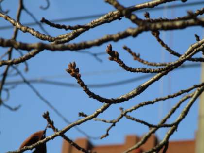 校門前のサクラの木も、すっかり葉を落としました。しかし、よく見てみると…。