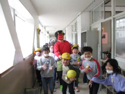 年に1度の節分です。子どもは鬼が来るかも…と朝からずっとドキドキしており、ついに昼休みに鬼が現れました。子どもたちはすぐに仲良くなれたようで、嬉しそうでした。