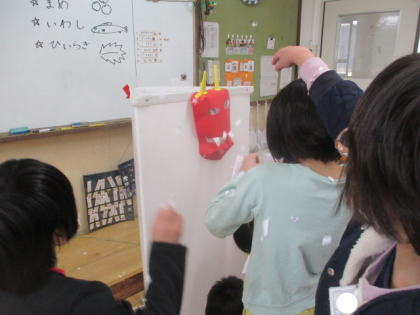 おにのお面に向けて、紙吹雪をまきました。まいた後はみんなできちんと掃除をしました。