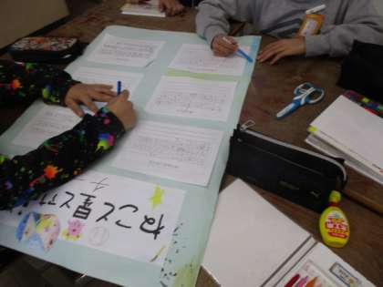 そのことを2年生に伝えるために,ポスターを書いています。