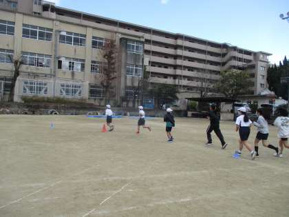 中間マラソンもがんばる中、体育の学習では自分のペースで6分間一生懸命走っています。
