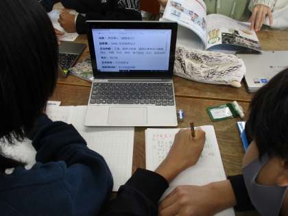 日本国憲法の基本的な考え方について、教科書や図書資料、タブレットを使って調べ学習を行いました。子どもたちは個人で調べたことを班で共有したり全体でまとめたりして情報を集め、整理していました。