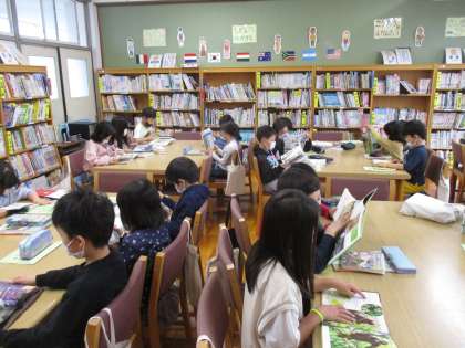 国語科では全学年で「本は友達」の単元があり、図書館に詳しくなるための学習をします。今日は3年生が本の並び方を知り分類について学びました。もうほかの図書館に行っても必要な本を探すことができますね。
