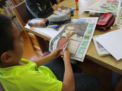 新聞の写真を使って額縁をかきました。初めてやってみましたが、子どもたちは新聞の中から必要な情報を抜き出すことができていました。