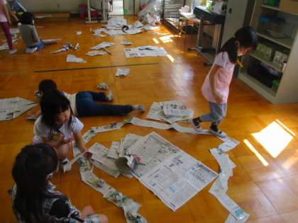 前の時間の活動を生かしながら、新聞紙を袋状にしたり,紙をつないだりと工夫が見られました。活動の終わりの時刻が近づくと、「もう終わり?もっとやりたい!」「家でもやってみよう。」と話していました。