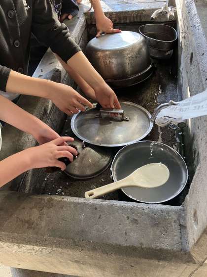 鶏すき焼き風煮をお腹いっぱい食べた後は、みんなで後片付け。