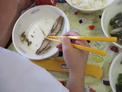 給食で「さんまのかわり煮」がでました。おはしを使って骨を取って食べていきます。食べ方を教えると、一生懸命の様子。「先生、できた!」「食べたよ!」上手に食べられていてびっくりでした。