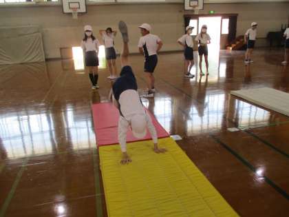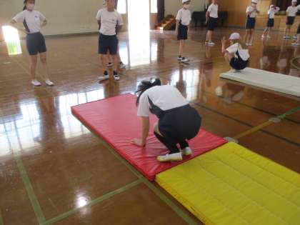 体育でマット運動の学習が始まり、今日はできる技を確認をしました。子どもたちは1つ1つ丁寧に確かめていました。