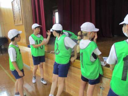 体育ではバスケットボールの学習をしています。グループで声を掛け合いながら楽しそうに活動しています。作戦タイムでは、勝つための方法を考えていました。