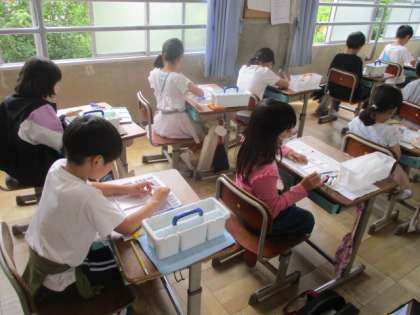 自分で描いた魚のうろこに、一枚ずつ絵の具でぬっていきました。