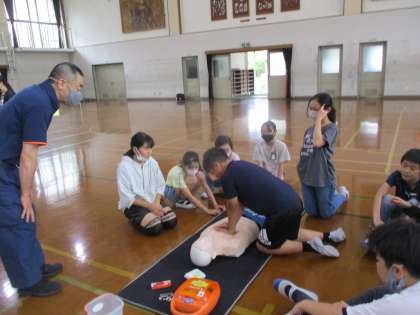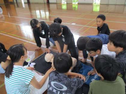 今日は、救急救命講習を受けました。まずは100回ずつ心肺蘇生をしました。同じリズムで押し続けるのは難しかったようでだんだん早くなっていましたが、同じグループの人たちで声を掛け合ってできていました。