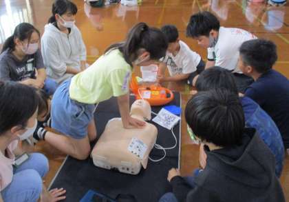 次に、AEDを使う練習をしました。一人の人が心肺蘇生をしながらもう一人の人が協力してAEDのパットを貼っていました。今日学んだことを使わないことが一番いいですが、もし何かがあった場合、率先して助けられるようになるとよいですね。