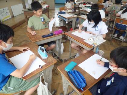 図画工作科では、山の家での思い出をふり返り、そのときに感じた気持ちを絵に表しています。