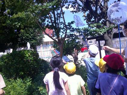 虫取り網で捕まえた後、少しセミを観察して、すぐに逃がしました。