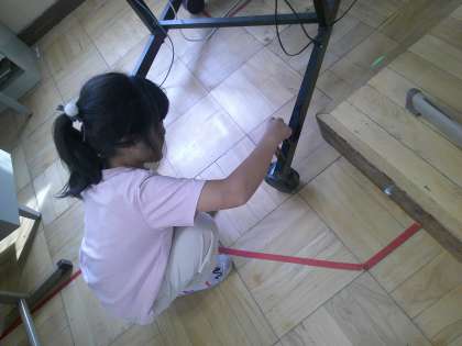 「つくえの上(木のところ)はつかないな。」「ドアにはくっつくよ。」と話しながら調べていました。