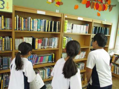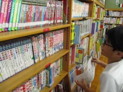 読み聞かせの後は、自分たちも図書館の本の題名を使って、しりとりを探しました。