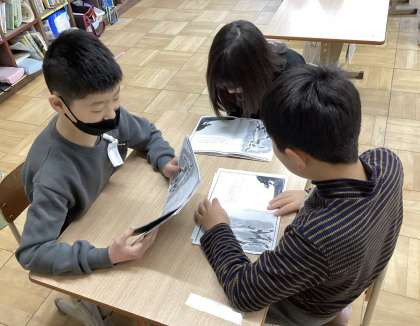 「3匹のやぎのガラガラドン」と「てぶくろ」をそれぞれのグループで話し合いながら、声色を変えたり、声の大小を変えたりと工夫して練習しています。