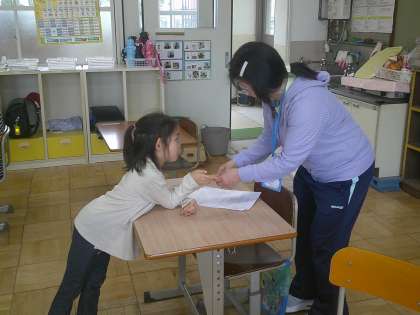 1年生は自分カードを先生に渡す練習をしています。