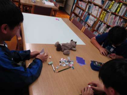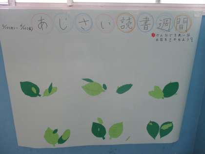 そして期間中、本を借りた人は図書委員が心をこめて折ったあじさいの折り紙をもらって、図書館前の模造紙に貼っていきます。本をたくさん読んで、みんなですてきな花を咲かせましょう!