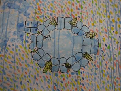 花をスタンプしたり、雨を絵の具を垂らして表現したり、思い思いの方法であじさいを表現しました。