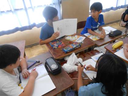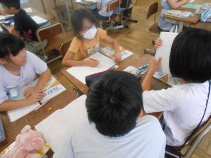 つなぐ4年生 算数 「式と計算の順じょ」2 公開日 2024/09/12 更新日 2024/09/12 4年生 式を線で結んで、計算する順番をかき入れたり、説明を言葉で書き込んだりして、自分なりのノート作りをしている子どもたちです。 説明するときには、自分の考えが伝わりやすいように、「相手に自分のノートを見せながら、考え方を指し示せるといいね」と伝えています。
