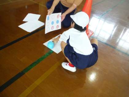 「パズル&コーン」は、コーンのところまで走って、指定されたカードの通りに各色のボールを並べ、次の走者にタッチする、変則折り返しリレーです。少し切り口を変えるだけで、新鮮な気持ちで取り組めます。「走るのが楽しかった」という感想を伝えてくれた子どももいました。