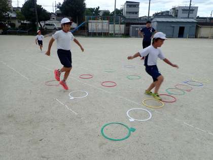子どもたちは、コース上に置かれたマット、ケンステップ、ミニハードルに挑戦しながら、ゴールまで駆け抜けました。