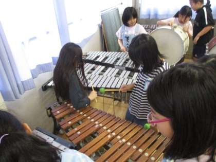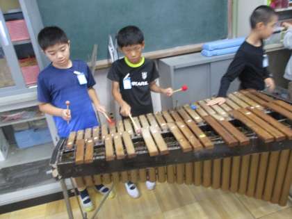 音楽室で、いろいろな打楽器の音をたしかめそれぞれの特徴を活かした音楽をグループで作っています。