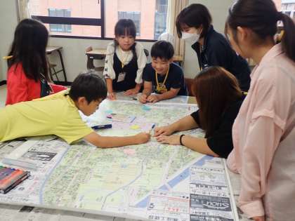 今回は、名札づくりをしたあと、拡大した砂川学区の地図に付箋を貼りながら、「自分の家」「おすすめの店」「好きな場所」「ひみつの場所」「あったらよいもの」を紹介しました。