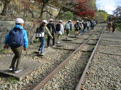 帰りは、長いインクライン沿いを歩きました。思った以上に距離が長くて驚いている子ども達でした。この距離を、インクラインを使って荷物や人を乗せて移動していたのですね。