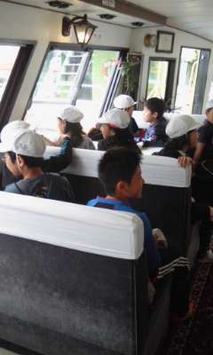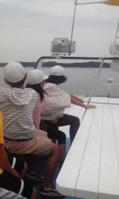 賢島から船に乗ってなかよし港に向かいました。船の中では,魚のことや島のことなど,たくさんお話を聞かせてくださいました。