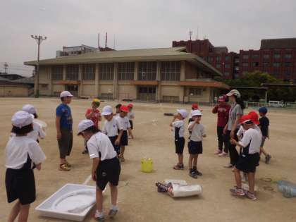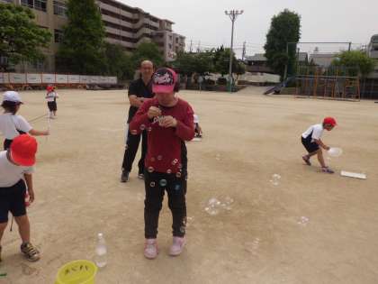 お天気も良く,空に飛んでいくシャボン玉を見ながら,「うわ〜!きれい!」と楽しそうでした♪準備を頑張った成果がでてよかったね!