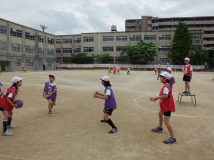 体育で「ポートボール」をしています。ポートボール台に乗っているゴールマンにボールがつながれば1点です。ボールを持っている人は動けないので,仲間とパスをつないでゴールマンまでボールをつなぎます。しかし,ゴールマンの前にはガードマンが立ちはだかります。作戦タイムにはどうすればうまくいくのか真剣に話し合っています。みんな楽しく取り組んでいます!!