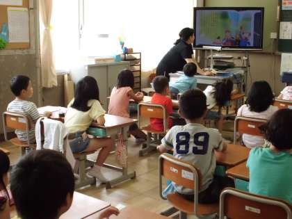 今日のおはようタイムでは,書画カメラで映された絵本の挿絵を見ながら,