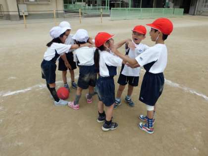 体育では「ころがしどっじぼうる」をしています。ゲームを始める前にはきちんと挨拶をすることや,自分たちで用意をすることなども学んでいます。あいさつの後は,チームみんなで力を合わせてがんばろう!という気持ちを込めて円陣を組んでいます。作戦を考えるチームも出てきました。協力しながら活動を楽しむ姿がうれしいです。