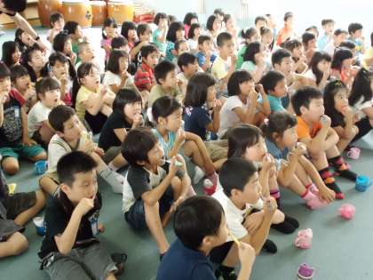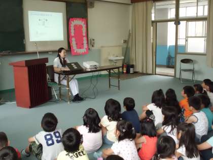 歯科衛生士さんに来ていただいて,歯についてのお話や正しい歯の磨き方について教えていただきました。歯ブラシの持ち方を確認した後,左上の外側からぐるりと歯を磨いていきます。大人の歯に生え換わり始めている子がたくさんいますので,毎日の歯みがきをがんばって歯を大切にしていってほしいと思います。