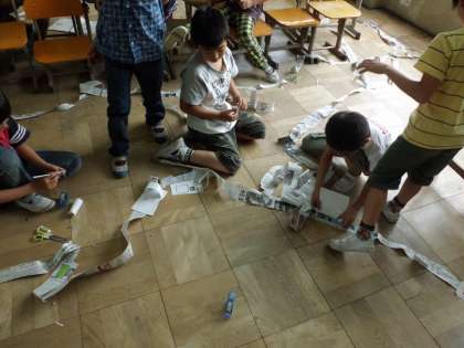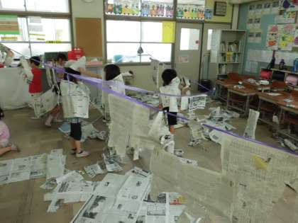 新聞紙で服や剣をつくったり,切ってつないで道をつくったりしました。