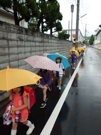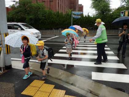 道の端を歩くこと,横断歩道をわたる前には右左を確認すること,傘はまっすぐにさすことなど,交通教室で学んだことをよく守って歩いています。おまわりさんと交通安全推進委員のみなさんも下校の様子を見守ってくださいました。どうもありがとうございまいた。