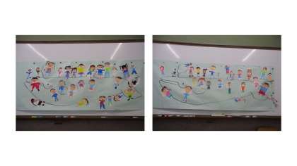 青空に向かって跳び上がる子どもたちの姿は、まるで本当にくじらぐもに届きそうでした。そして見て下さい!なんとさんどいっち1年生のみんなが、くじらぐもに乗ることができました!