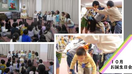 10月生まれの子どもたちのお誕生日会をしました。花道をくぐっての入場では「おめでとう!」の声と拍手が自然に広がり、あたたかい雰囲気に包まれました。