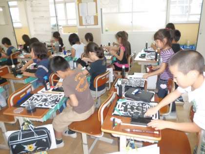 初めて使う筆に,ちょっぴり苦戦しながらも,