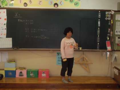 運動会も終わって,わかばの子どもたちはもうすっかりお勉強モードです。先日の算数では,黒板の「たて」と「よこ」どっちが長いかみんなで考えました。「うーん?」と考えているとT君がおもむろに前に出てきて身体をピンと伸ばして寝転がり「「1回,2回」と自分の身体を基準に測りだしました。「T君すごいなあ」「そうやなあ」とみんなびっくりです。「じゃあ,わたしも」とMさんは,何度か挑戦しペットボトルを「たて」に並べて「棒みたいにまっすぐ並べたらわかる。」とすばらしいアイデアです。