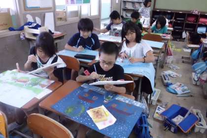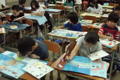 お話を聞き,イメージをふくらませ,絵を描いています。「雪がふっている風景にしようかな。」「妖精はどんな風に描こうかな。」と楽しく描いています。だいぶ進んできました。仕上がりが楽しみです。